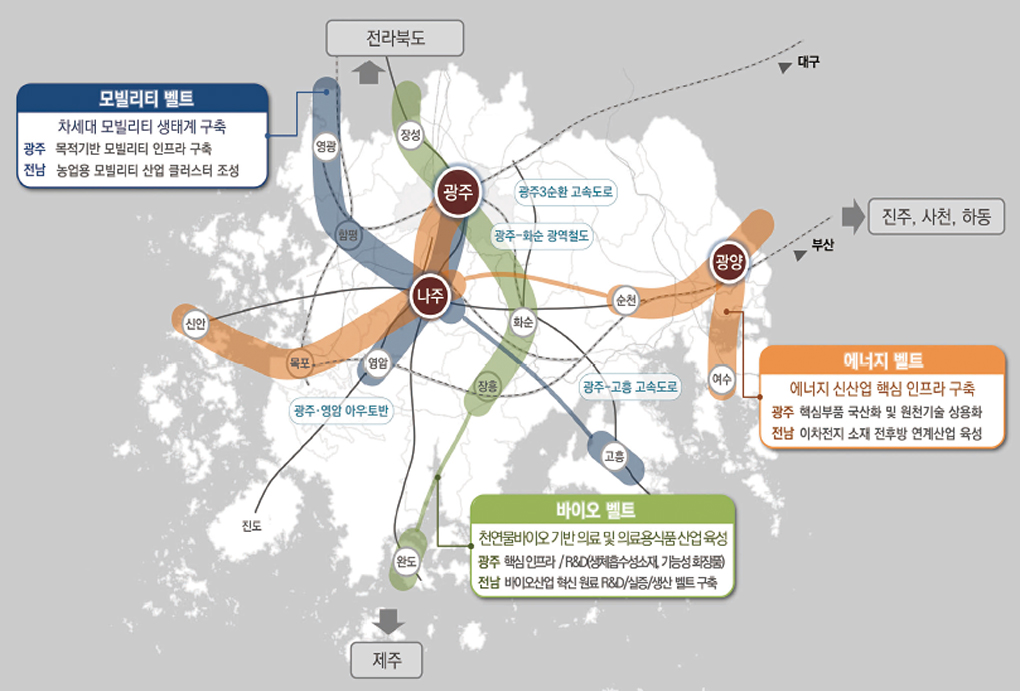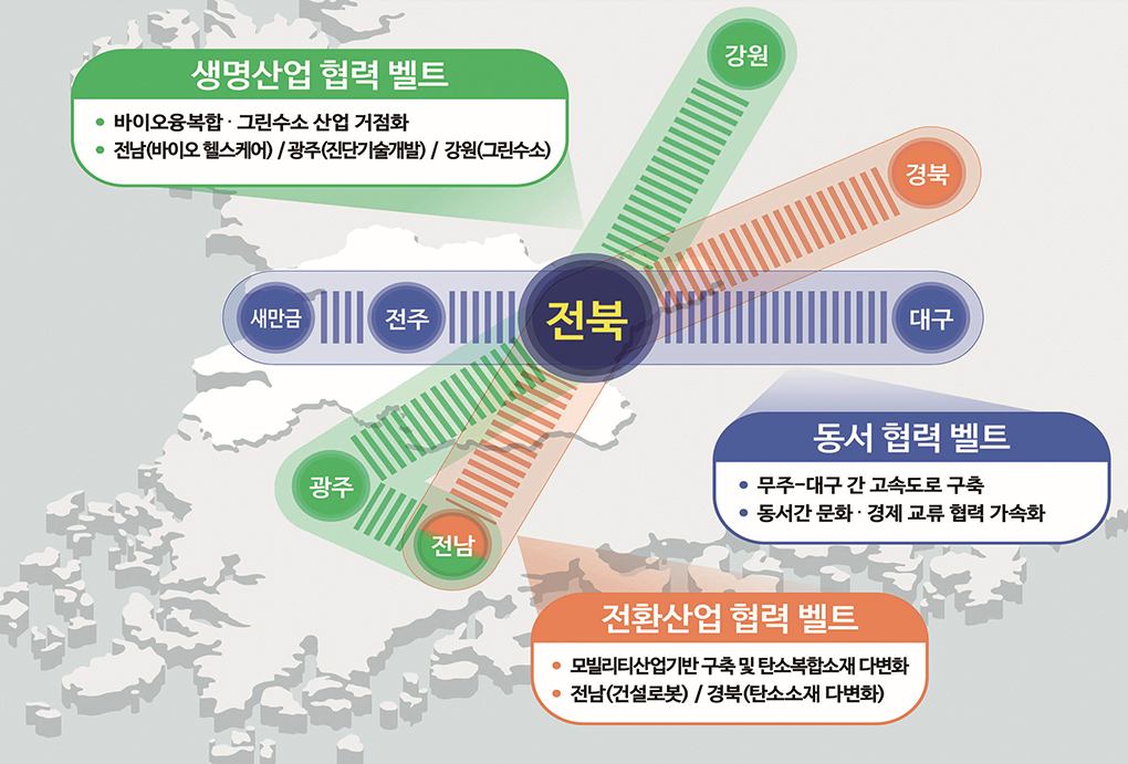 - 생명산업, 전환산업, 동서 협력 벨트 구축으로 바이오·수소와 모빌리티·탄소 산업의 연계 협력을 강화하고, 고속도로 구축을 통해 동서간 협력체계 기반 마련