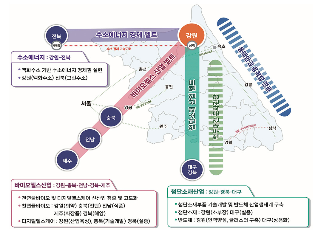 - 수소에너지, 바이오, 첨단소재, 반도체, 디지털헬스케어산업 초광역 협력, 동해안권·강호축 중심 백두대간권 관광벨트 구축을 통한 미래산업 글로벌 도시 조성