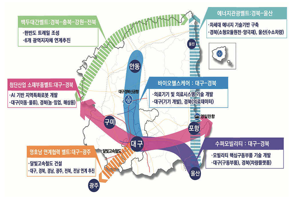 - 생명산업, 전환산업, 동서 협력 벨트 구축으로 바이오·수소와 모빌리티·탄소 산업의 연계 협력을 강화하고, 고속도로 구축을 통해 동서간 협력체계 기반 마련
